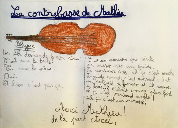 Chansons à nouveau chantées pour la kermesse de l'école. À cette occasion, la classe avait préparé un cadeau pour Mathieu Barbances. Une grande planche de dessins et de textes.